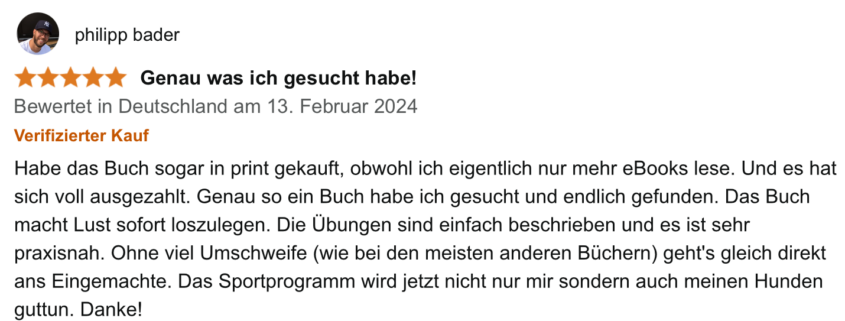 Ob Windmühle, Überkopfkniebeuge oder Rumänisches Kreuzheben: Mach deine Fitness-Übungen doch draußen in der Natur – ohne Geräte, aber dafür mit deinem Hund. Du und dein Vierbeiner sind sowieso jeden Tag zusammen an der frischen Luft unterwegs: Zusammen macht Sport gleich viel mehr Spaß und Ihr werdet gemeinsam fitter und vitaler! Welche Übungen sich eignen, wie gemeinsame Workouts für Hund und Halter aussehen können, was beim Zusammenstellen deiner Trainingspläne wichtig ist und wie du dein Fitness-Training in Punkto Kraft und Ausdauer optimieren können, erfährst du in meinem anschaulich bebilderten Ratgeber.